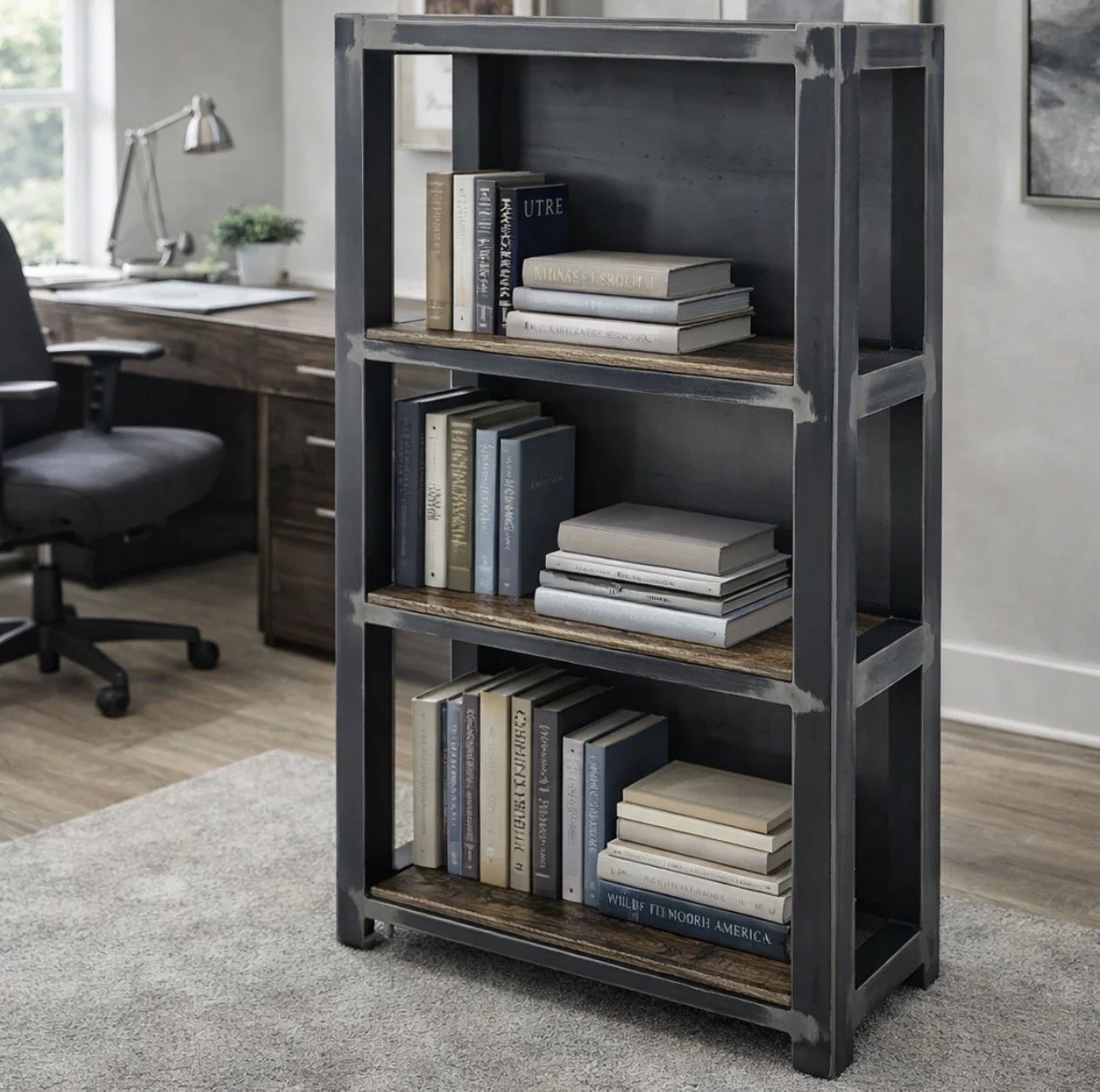 A bold blend of raw steel and warm wood, this 3 shelf bookshelf brings both strength and style to any space. Designed with open shelving for easy display and everyday use.